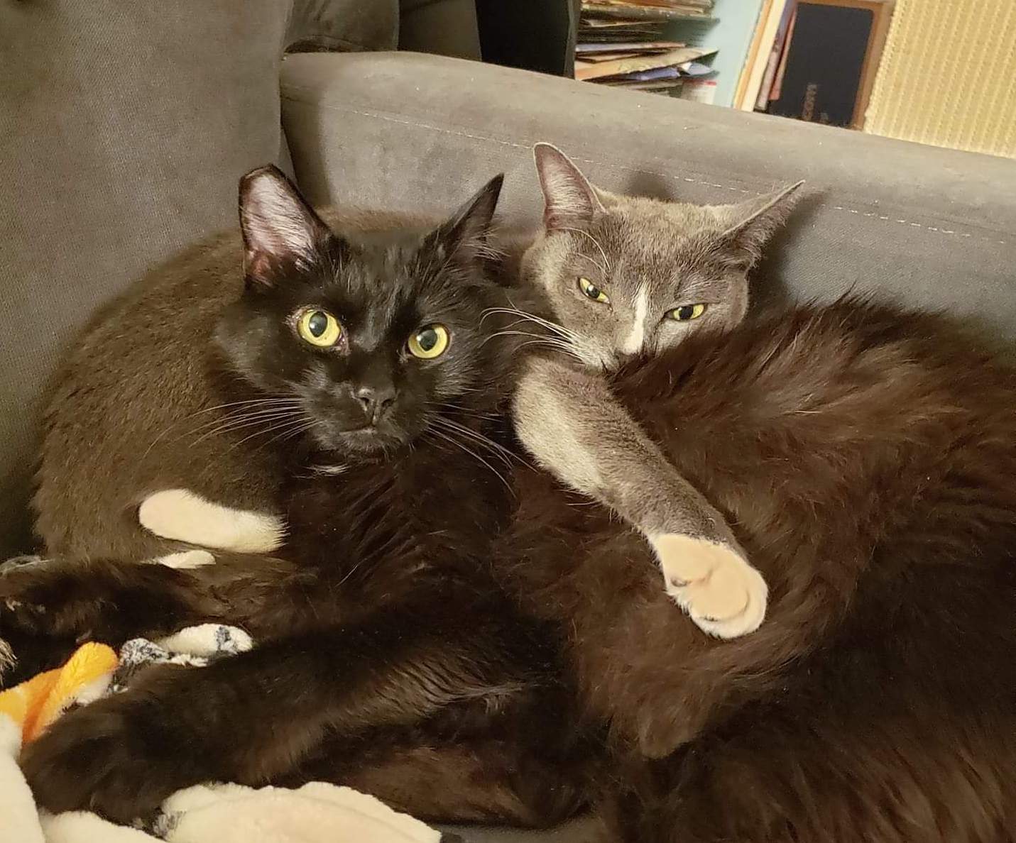The two cats we adopted are a bonded pair, both around four years old. They were received by the rescue after their previous owner suddenly passed away from cancer last September.