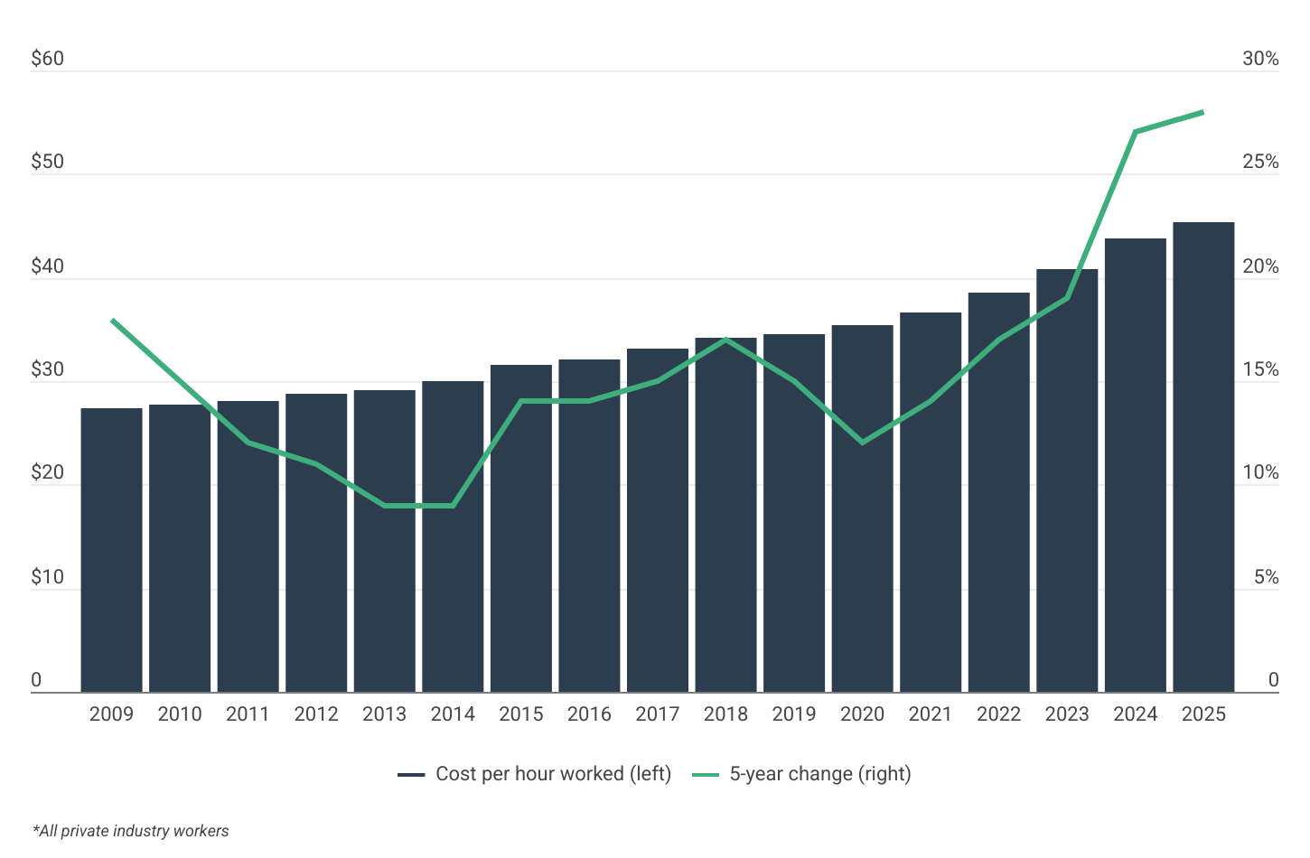 • Labor costs are rising quickly: Total compensation per hour worked reached $45.38 in March 2025, up 28% over the past five years—the fastest rate of growth in over 15 years.