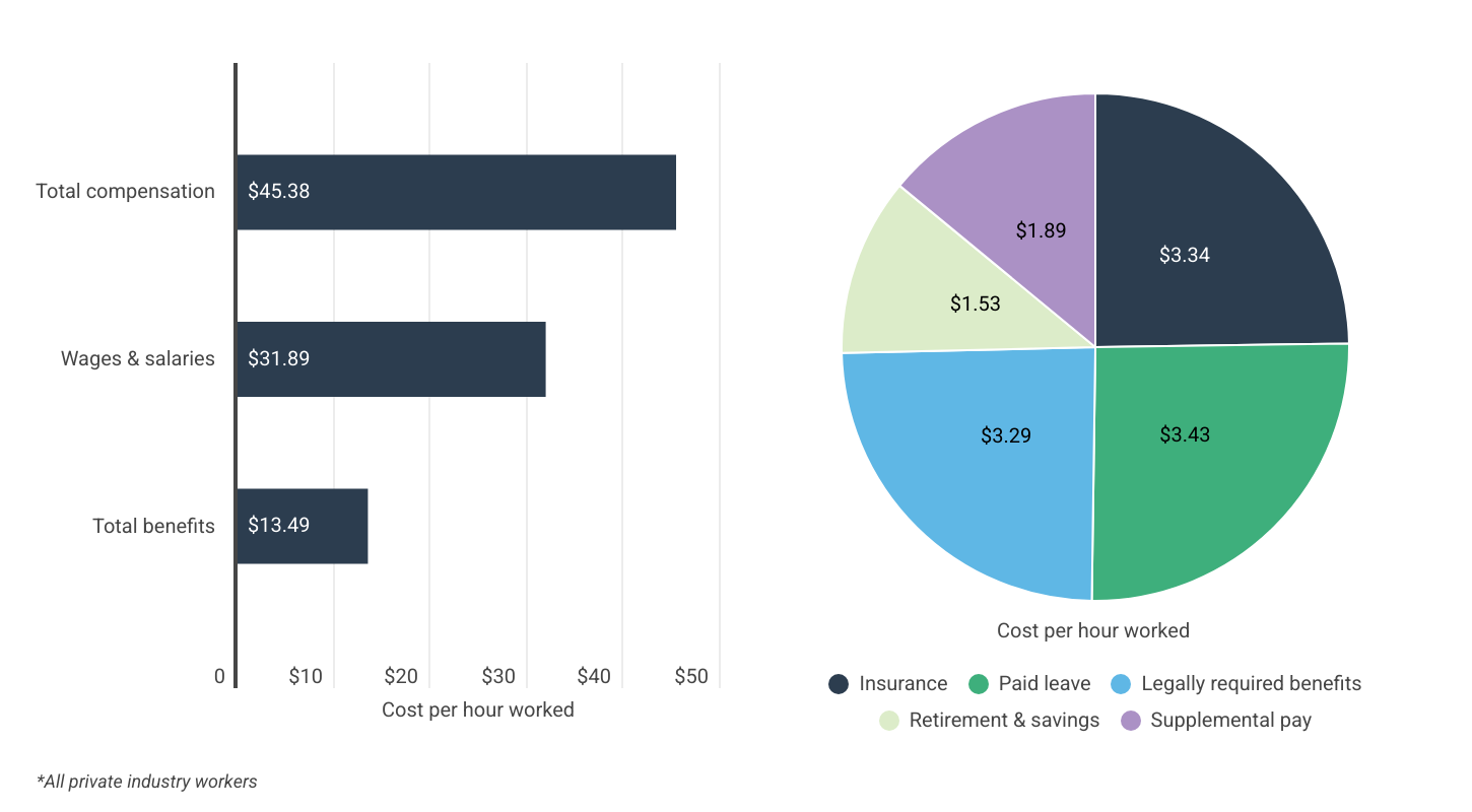 • Benefits account for a significant share: On average, benefits account for 30% of compensation costs, resulting in a labor burden rate of 42.3% for private-sector employers.