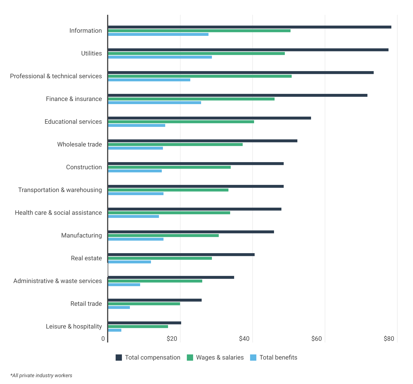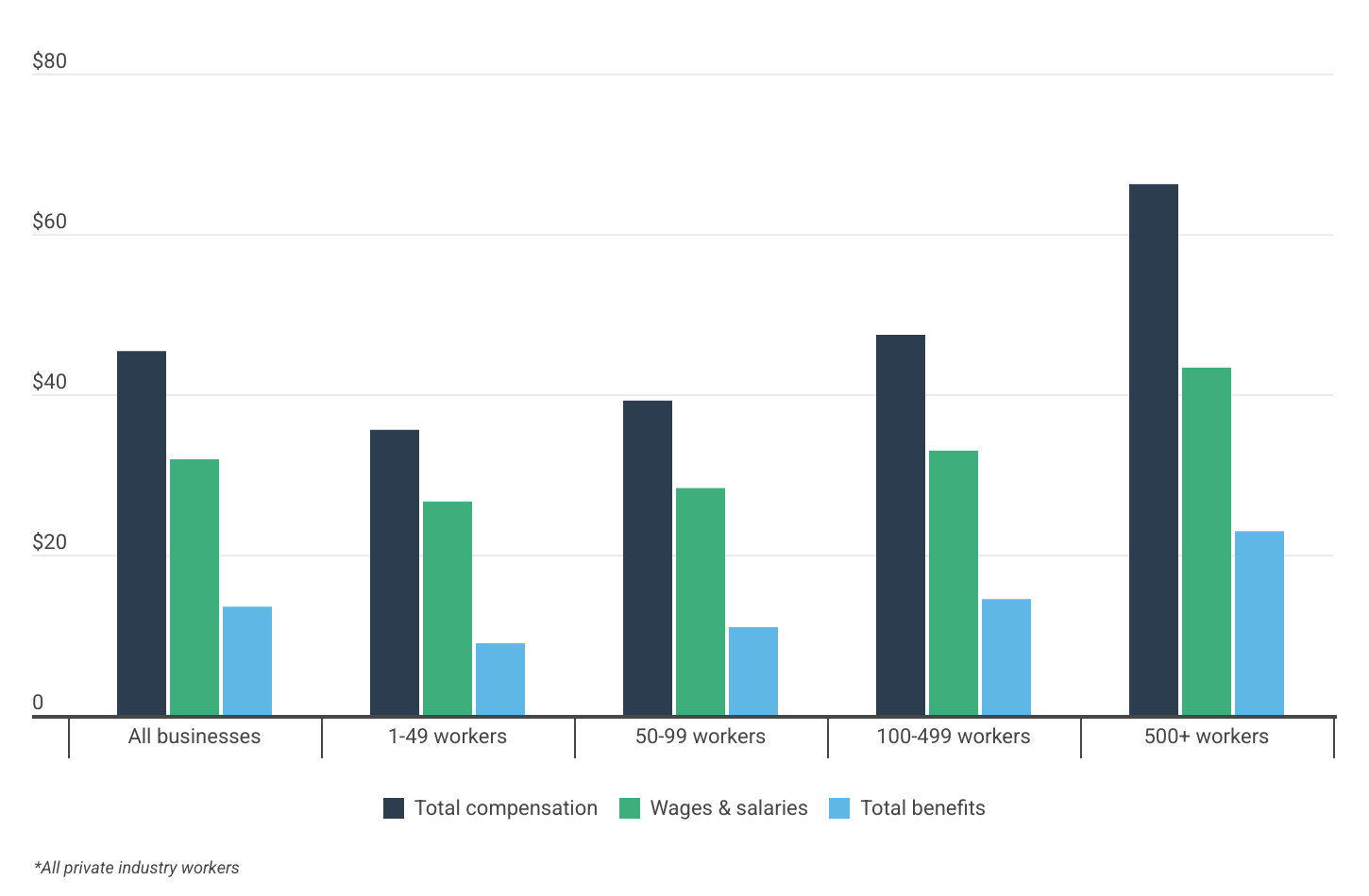 The data used in this analysis is from the U.S. Bureau of Labor Statistics’ Employer Costs for Employee Compensation (ECEC) program, which measures the average cost to employers for direct wages and a range of benefits.
