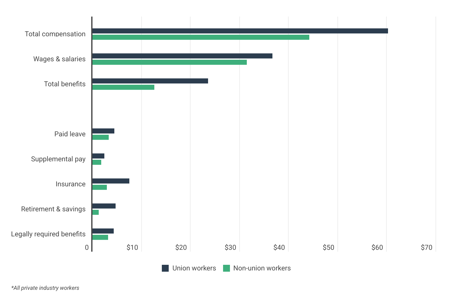 Despite benefits making up a larger share of total compensation, union firms also pay higher base wages, averaging $36.67 per hour versus $31.49 for non-union firms. This reflects the impact of negotiated labor agreements on both benefits and wages.