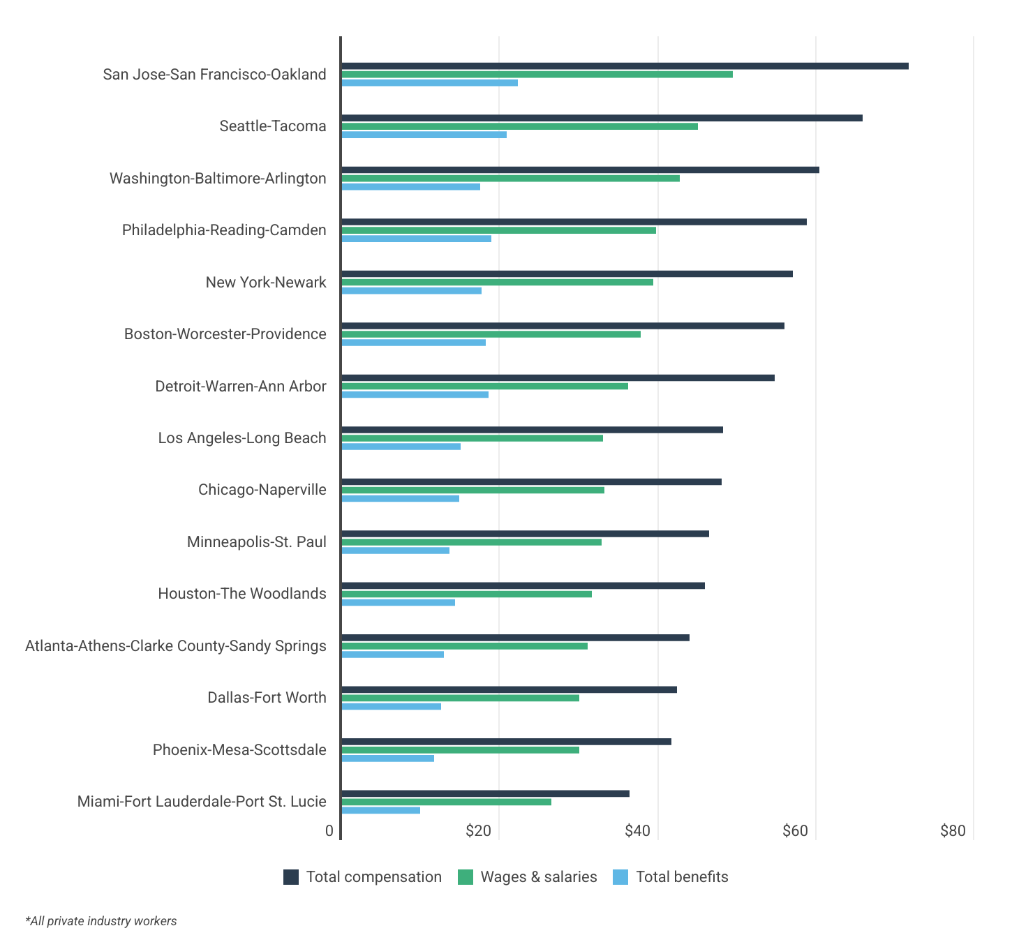 At the top of the spectrum is the Bay Area, where San Jose–San Francisco–Oakland leads all metros with an average compensation cost of $71.63 per hour. This is driven by both the highest wage costs ($49.43) and benefit costs ($22.20) among major metros, and reflects the region’s high concentration of information and technology jobs. In contrast, Miami ($36.37) reports the lowest overall compensation cost. This is partly due to a greater share of lower-skilled service jobs—often in leisure, hospitality, and retail sectors—that tend to offer lower wages and limited optional benefits.