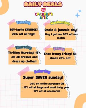 Voted ‘Best Children’s Store in the Tri-Cities’ three years in a row, Children’s Attic is open Tuesday through Saturday offering deals throughout the week.