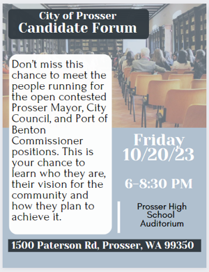 The City of Prosser Candidate Forum is set for Friday, Oct. 20 from 6 p.m. to 8:30 p.m. at the Prosser High School Auditorium. Voters will have the chance to meet candidates for the mayoral seat and the Port of Benton Commissioner and ask questions about their community vision.