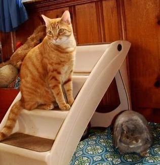 Ann Jorgensen (Alaska) Yes. So … kitties and a house chicken and kitties and a house rabbit. (This is what happens when you work at a shelter.) Stewart, or Stew, loved all animals. I saw Stew walking through the hall in our intake area when he was a young kitten. What caught my eye was that his back was shaved and he had several sutures. Vet thought a raptor had attempted to take off with him. I couldn’t leave him in the shelter; I actually scooped him up and took him to my office. I realized then he was a short-legged cat, known as Munchkin, but he was out of a feral colony. Stew is such a goofball and loves everything. One time I watched him scale a tall cat tree with his teeth. I love his quirky personality, even his crossed eyes and ear fluff (I called it newt ears). I now have Ben, a very big bunny, a continental mix from the shelter, and Betty, also from the shelter.