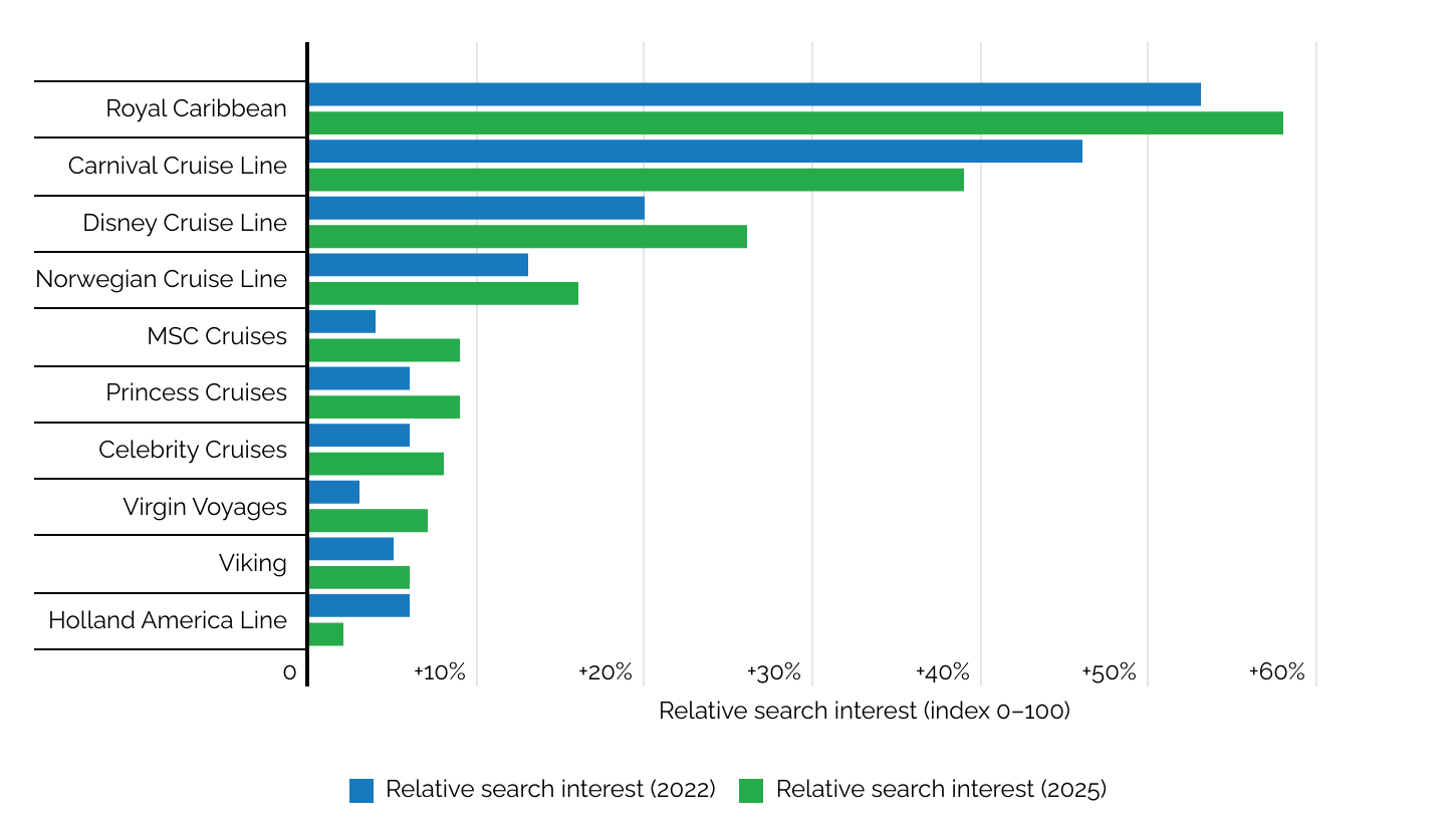 - Royal Caribbean leads, but most major lines are growing. Among the top 10 cruise lines, eight saw increased search interest from 2022 to 2025.
