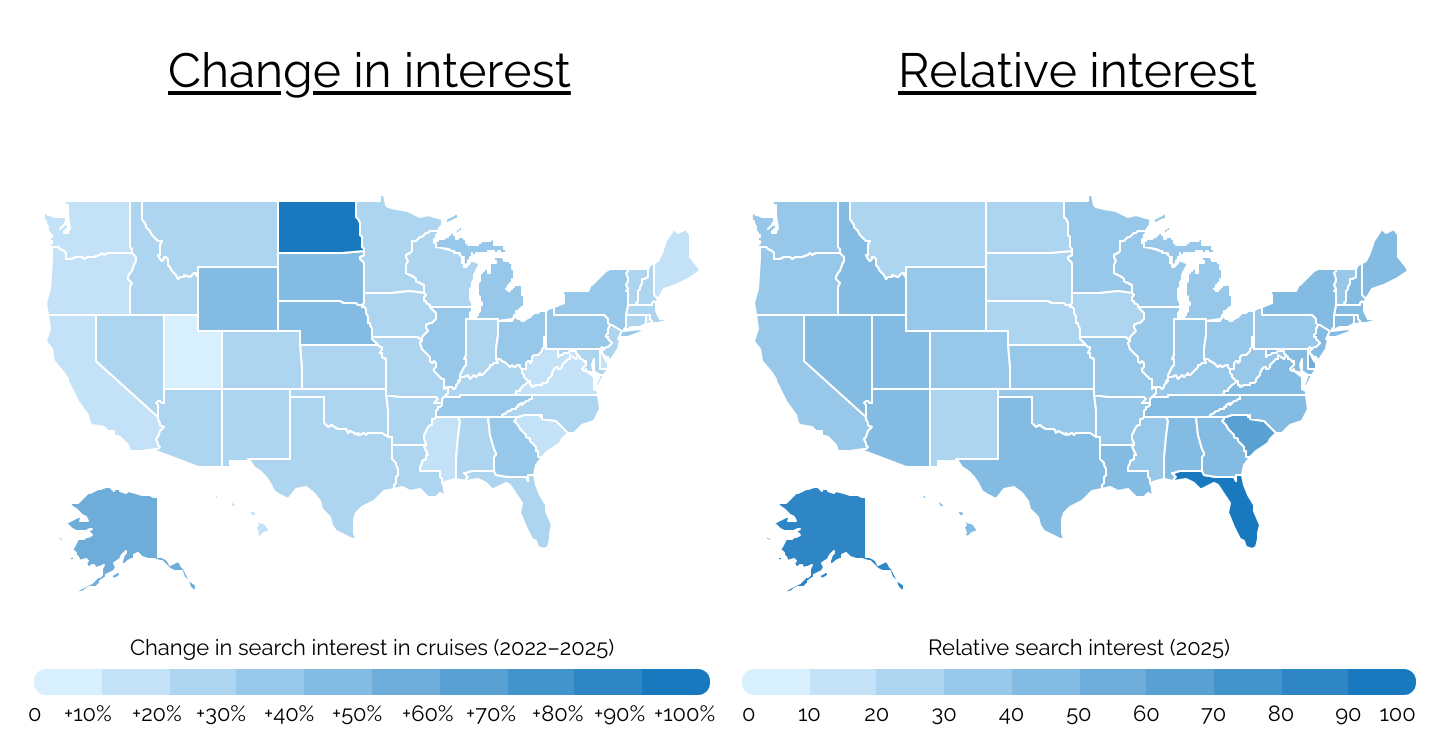 - Interior states are seeing a surge in cruise interest. While coastal states lead overall search interest in cruises, rural interior states like the Dakotas, Wyoming, and Nebraska are seeing the fastest growth.