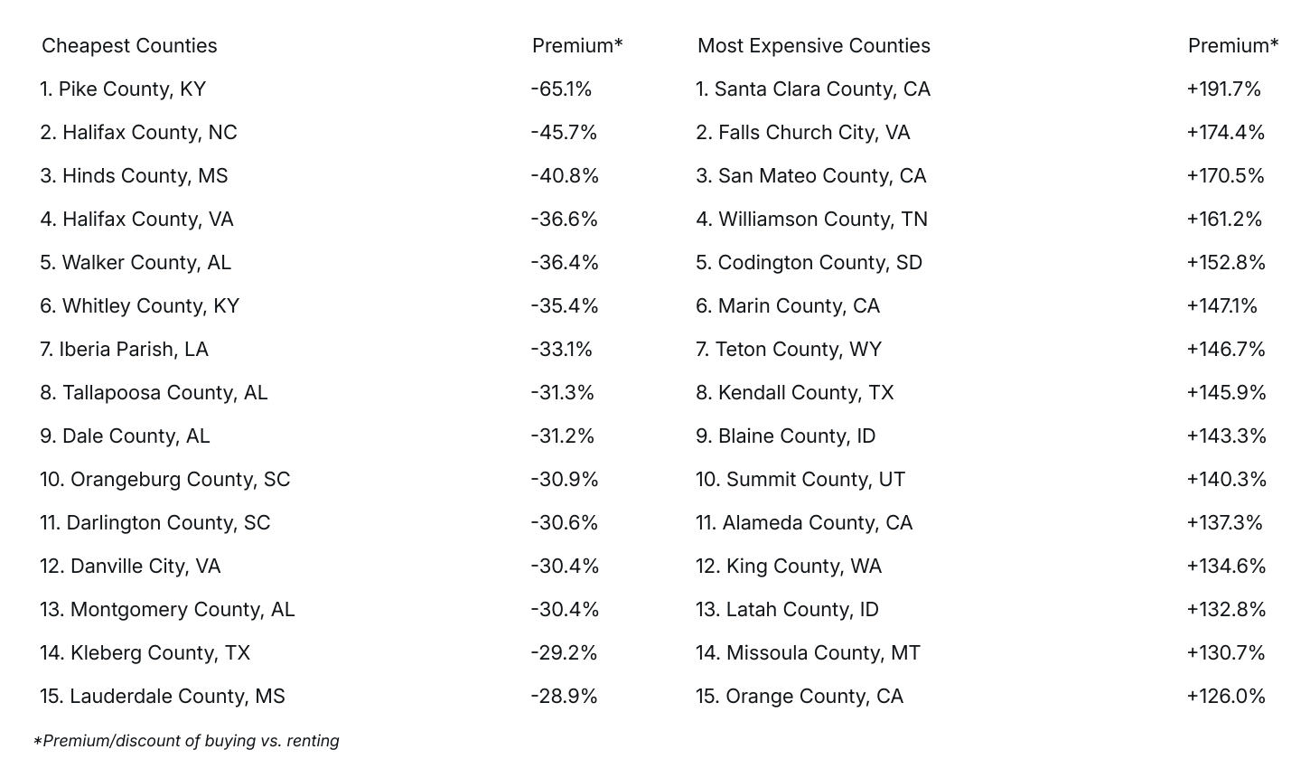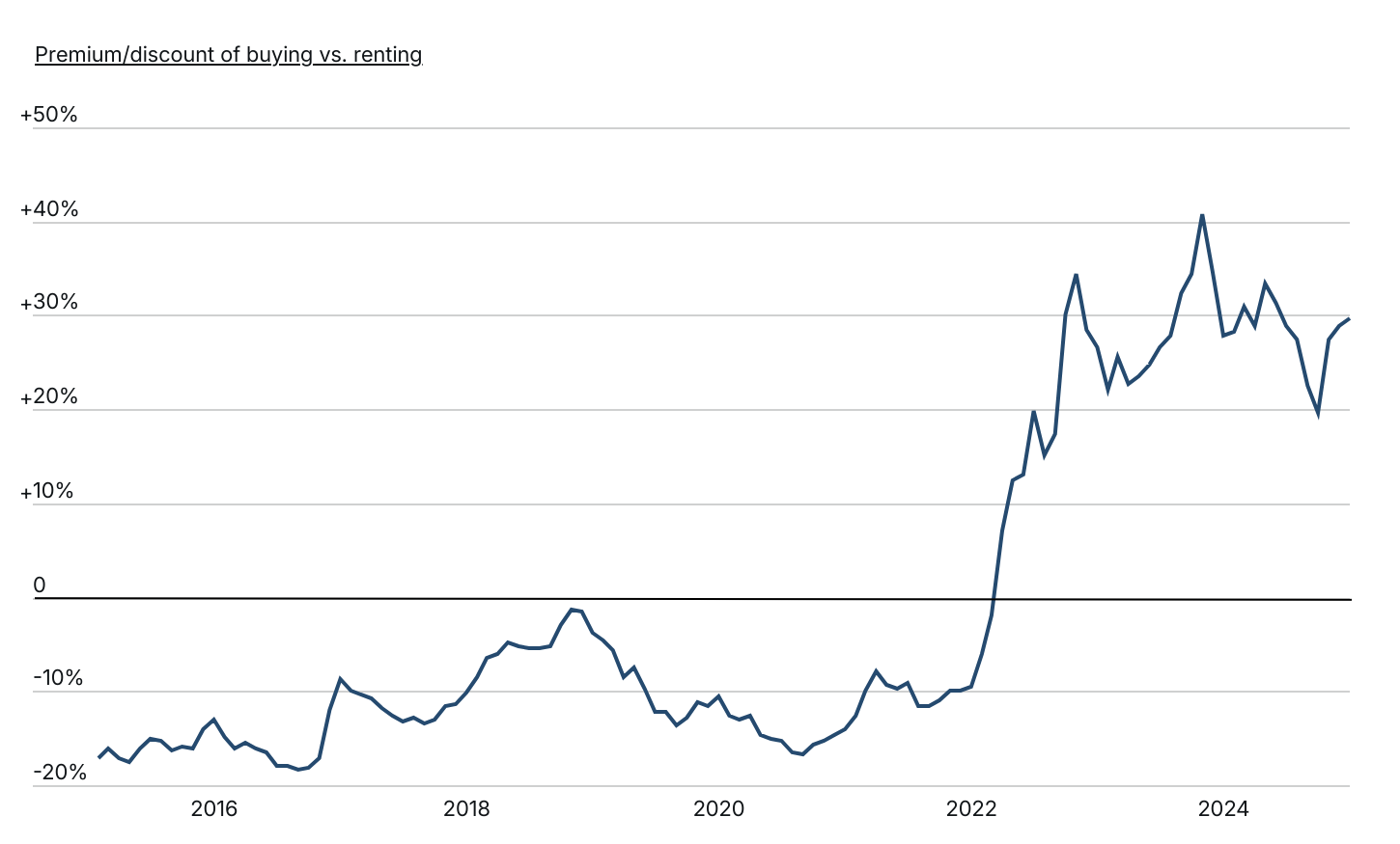 • The affordability gap flipped fast: Since the start of 2021, mortgage rates have more than doubled and home prices remain approximately 33% higher, driving a surge in the “buying premium” across most U.S. markets.