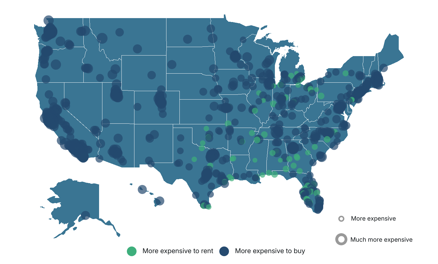 • Only a small fraction of cities favor buyers: Just 95 out of the 838 U.S. cities analyzed still offer a cost advantage to buying—mostly in lower-cost Southern and Rust Belt markets.