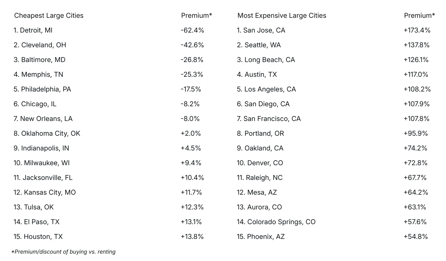 • Location drives extreme differences: In over 100 cities, the median monthly mortgage payment is now more than double the median rent. But places like Detroit and Cleveland offer 40% to 60% savings for buyers compared to renters.