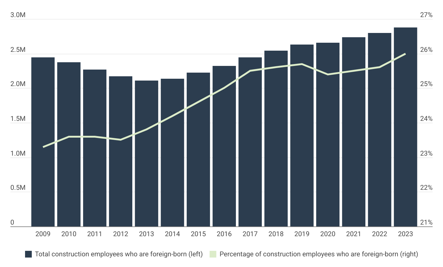 In 2009, immigrants made up 23.3% of all construction industry employees. That share has grown nearly every year since, reaching 26.0% by 2023. Over the same period, the total number of foreign-born employees in the construction sector rose by more than 435,000, from over 2.4 million to nearly 2.9 million. This suggests a gradual but sustained increase in the industry’s reliance on foreign-born workers—a shift that continued through the economic recovery after the Great Recession and into the post-pandemic construction boom.
