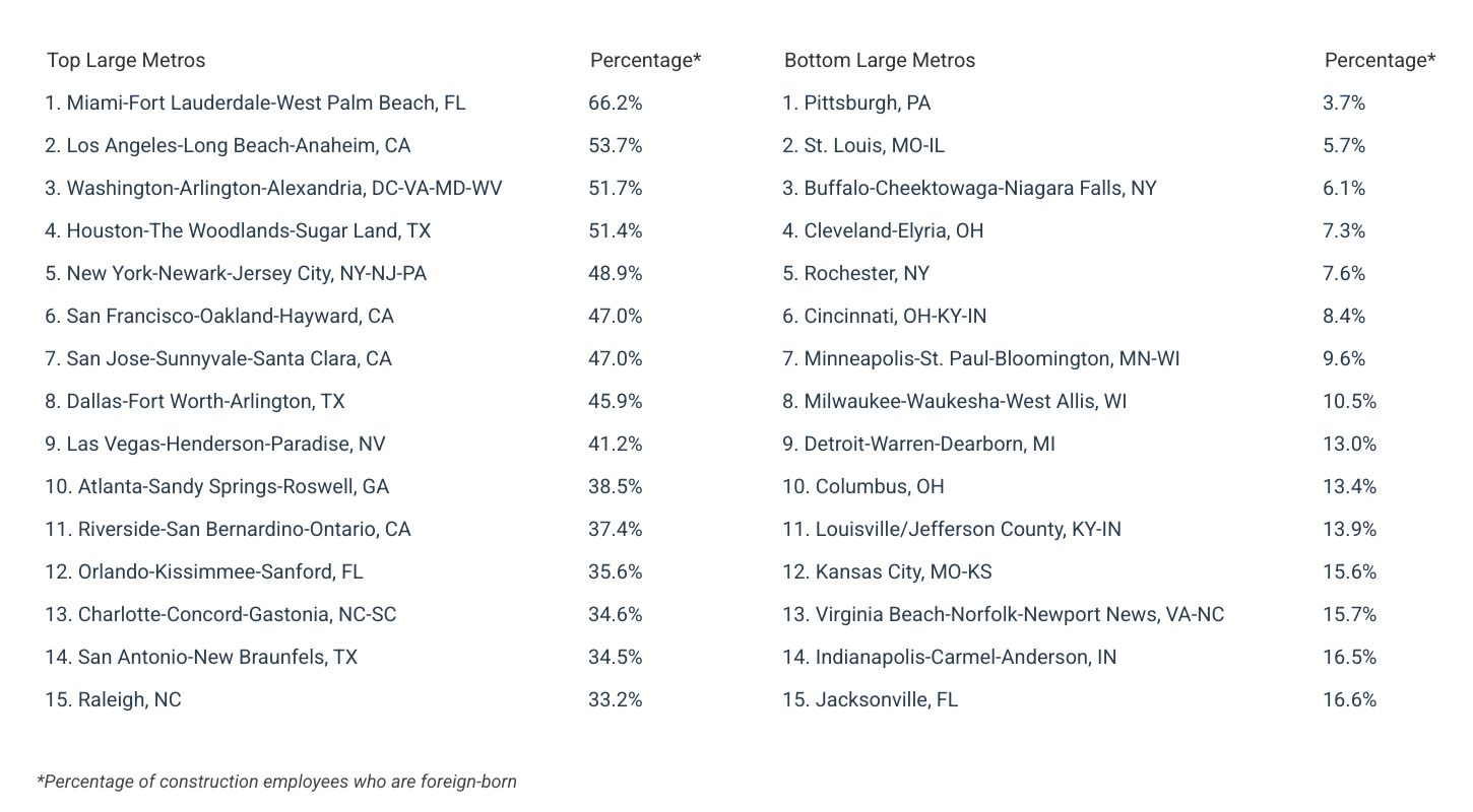 • Immigrant employees make up a majority of the construction industry workforce in several major metros. In cities like Miami, Los Angeles, DC, and Houston, more than half of all construction industry employees are immigrants.