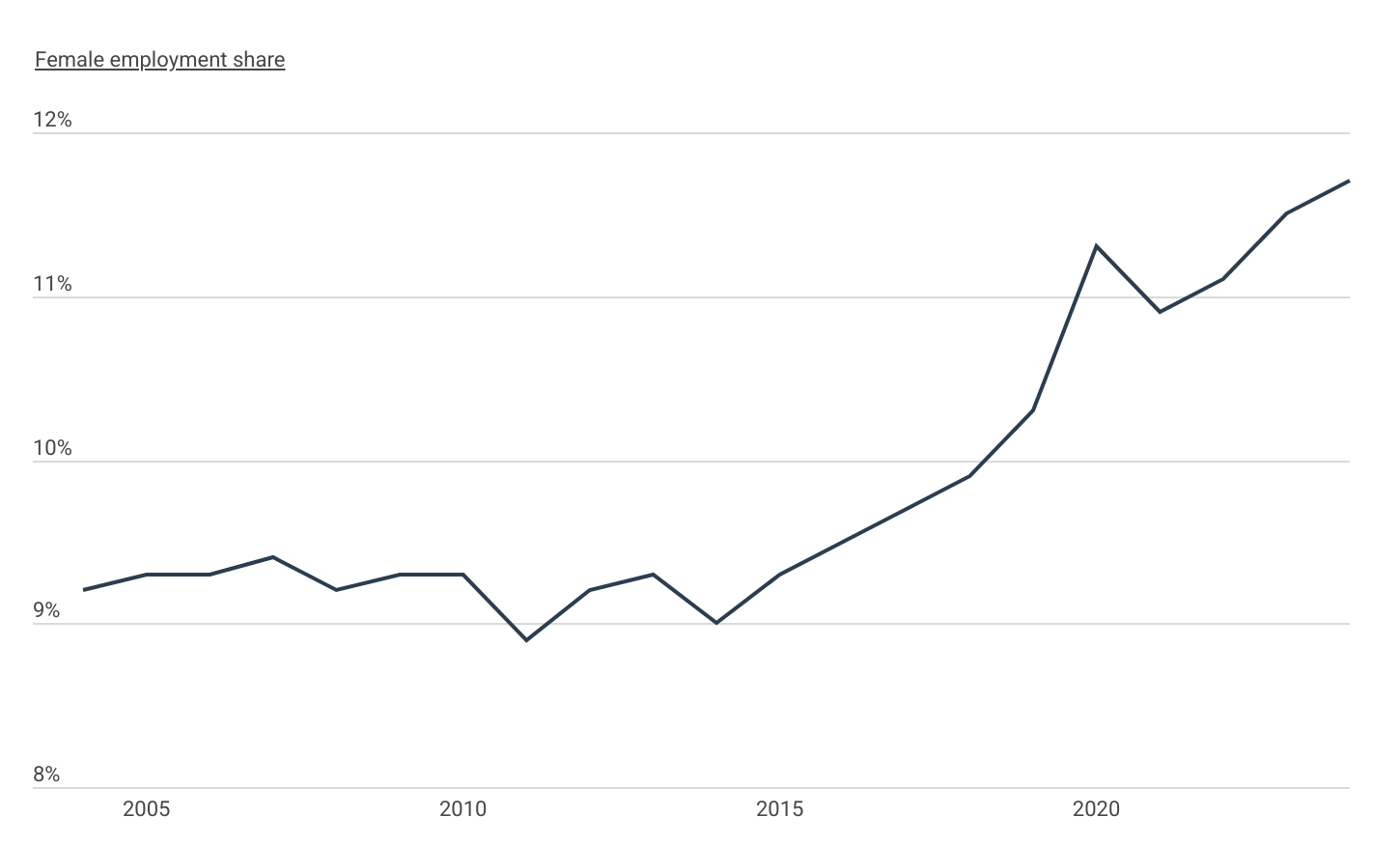 The share of women in construction has steadily increased over the past several years. While women remain underrepresented in the workforce, the data reveals a gradual yet consistent upward trend in female employment within the construction sector.