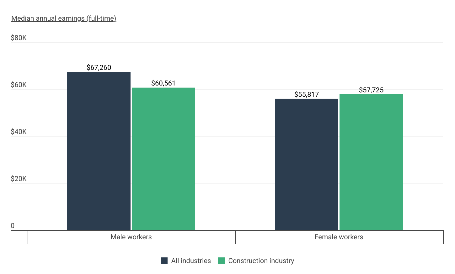 Interestingly, the opposite is true for men in construction, who typically earn less than their counterparts in other sectors. Male workers in the construction industry have a median annual wage of $60,561, compared to $67,260 for male workers across all industries.