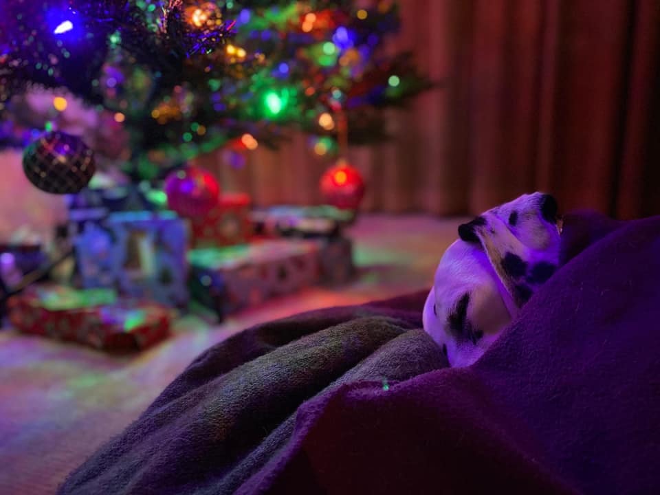 Gail S. Green (Oregon) Lots of socializing, quiet games in the evening. Cuddles with my electric blanket in the recliner. I also have a crumpled up pile of three or four lightweight blankets on the sofa and floor so she can bury herself. Keep established routines intact. Keep demands on her time and behaviors when people come over to a minimum. Use the crate freely. Do not introduce new treats that people give to your dog as gifts. Stick with the regular daily treats and introduce gift treats when the hubbub dies down a few days after the holiday. Introduce in small amounts—gift treats are often richer and more sugary than regular treats.