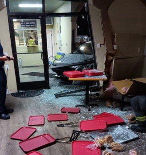 No one was injured in the incident, according to Groom. The crash damaged the glass door and railings of the building.