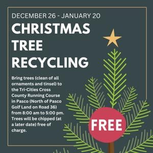 From Dec. 26. to January 20. 2025 you can drop off your Christmas tree for recycling at the Tri-Cities Cross Country Running Course in Pasco anytime between 8 a.m. and 5 p.m.