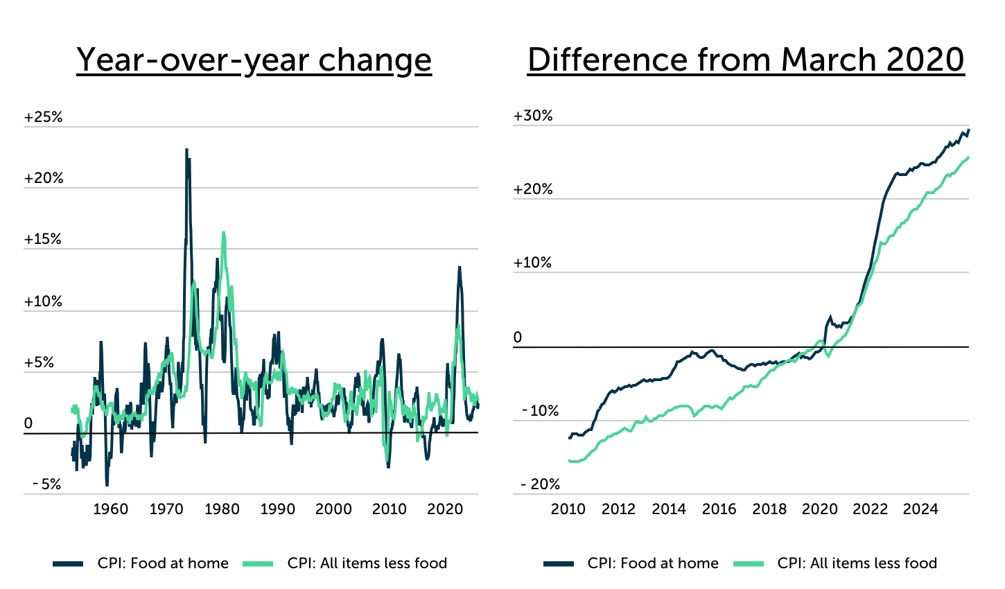 - Grocery inflation has outpaced broader inflation since the pandemic began. From March 2020 to December 2025, the Consumer Price Index (CPI) for food at home rose 29.4%, compared to 25.6% for all other items excluding food.