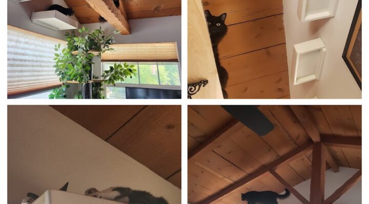 I asked friends online: “Tell us about the home improvements you’ve made for your cats, please! Catios, climbing structures, sleeping spots, etc. Photos, too!”