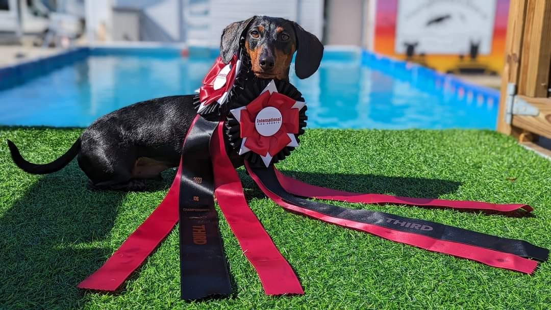 Erin Saywell (Indiana) Soggy was a year-old dachshund in a bad home. My friend was organizing his rescue and transport to me … and was texting me his info. The one text stated that his name was Soggy. I just shook my head and thought, “What a weird name.” A few minutes later, there was another text saying, “OMG autocorrect! His name is ZIGGY, not Soggy!” We have another dachshund named Figment, who we call Figgy, so we just said “We’ll just call him Soggy, because it doesn’t matter, HE’S ONLY A FOSTER.” A few years down the road now, he’s obviously stayed with us, and kept his name. He loves water, so it turned out to be pretty apt. He’s an amazing dock diver! His registered name is Herart’s Ducking Autocorrect.