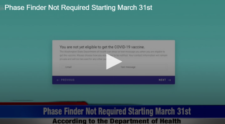 Phase Finder Not Required Starting March 31st by Fox 11 41 | @ | March 29, 2021 3:30 pm TwitterFacebookGoogle+LinkedInPinterest 0 There have been some changes to how to schedule your COVID vaccine. Watch the video to learn more.Related Posts Space Junk Damages Space Station Summer Camps for Kids and Safety Tips Sports Update