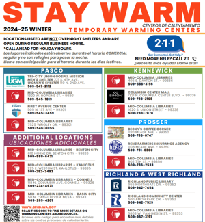 Tri-City Union Gospel Mission Men’s and Women’s Shelters. 509-547-2112Mid Columbia Libraries (both branches) 509-545-1019 and 509-546-8055First Avenue Center. 509-545-3459