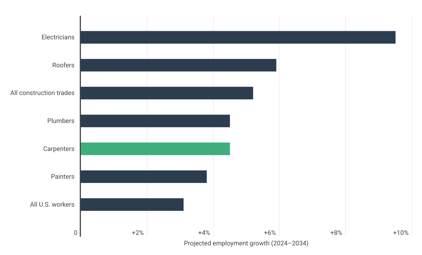 - Job prospects remain strong despite headwinds. The BLS projects total carpenter employment to grow 4.5% in the coming decade, ahead of the 3.1% average across all occupations.