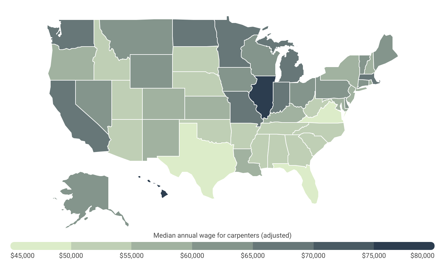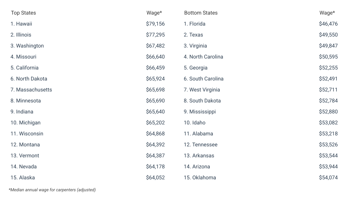 Adjusted for cost of living, carpenter wages range from a high of $79,156 in Hawaii to a low of $46,476 in Florida