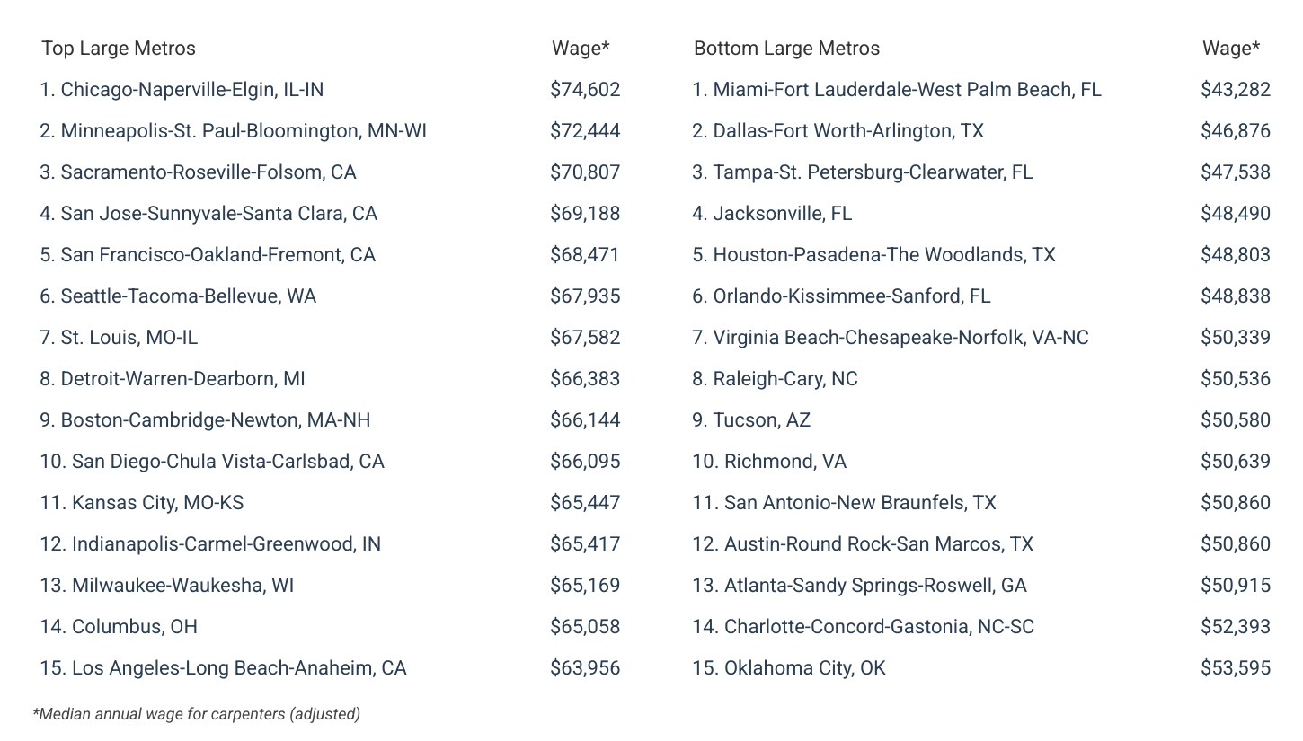 Unsurprisingly, at the metro level, several locations in the Midwest and on the West Coast are also among the best-paying for carpenters. Among major metropolitan areas with populations of one million or more, Chicago, Minneapolis, and Sacramento rank as the top three best-paying cities for carpenters.
