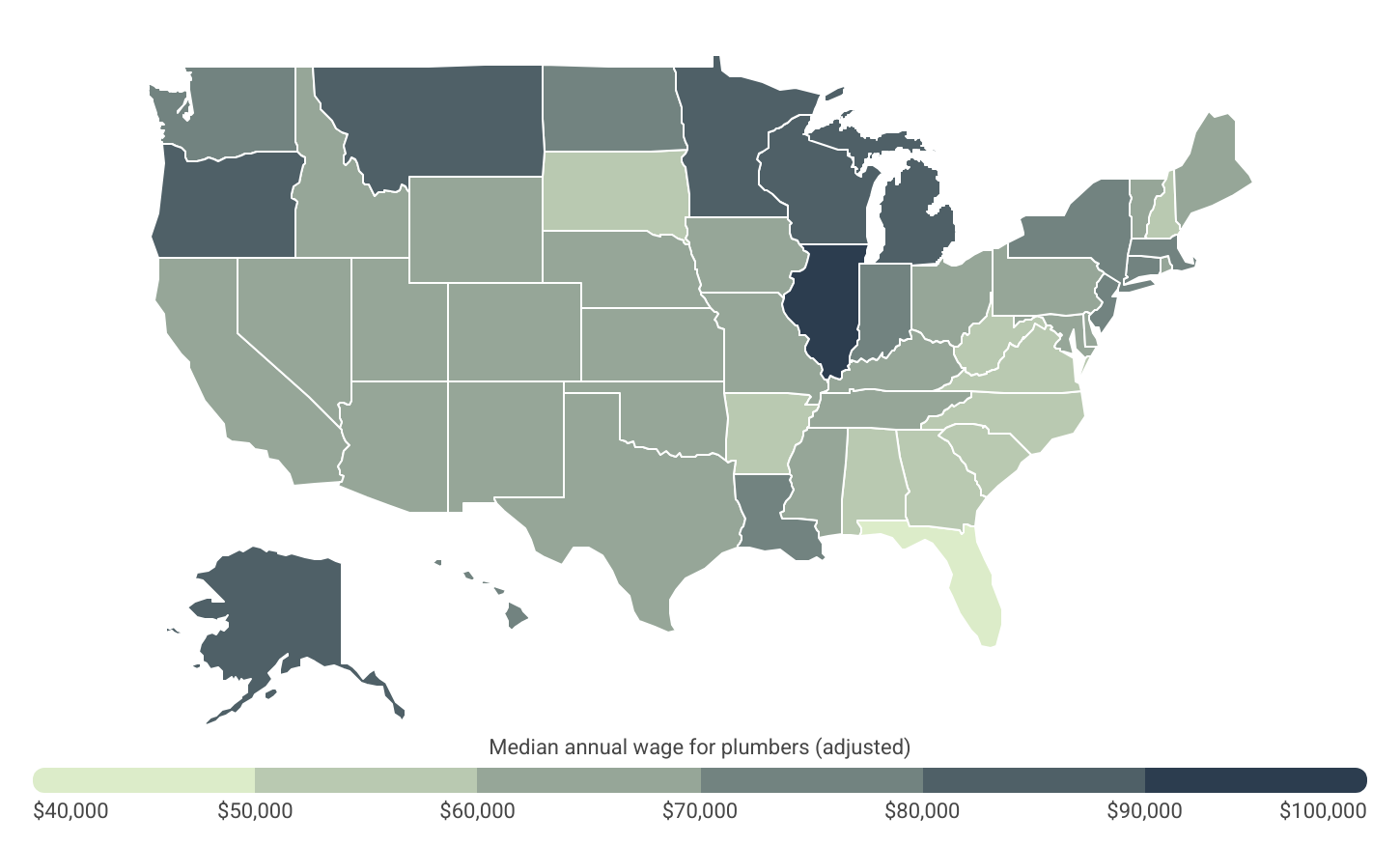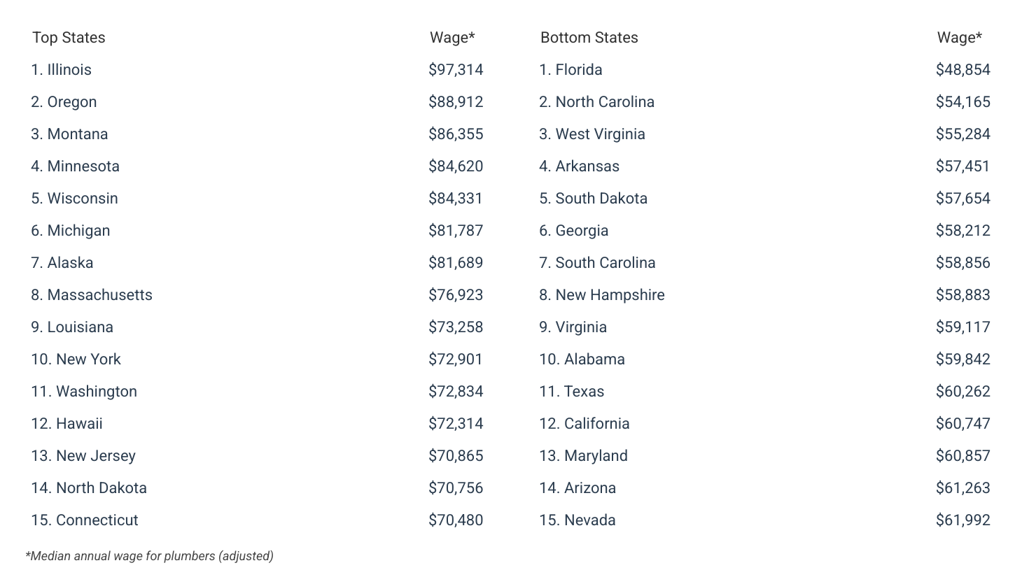After adjusting for cost of living, plumber salaries vary widely across the United States. At the top of the list is Illinois, where plumbers earn an adjusted median wage of $97,314—nearly double the adjusted wage at the bottom of the rankings in Florida ($48,854). Illinois and Florida are also the top- and bottom-paying states for construction workers overall.