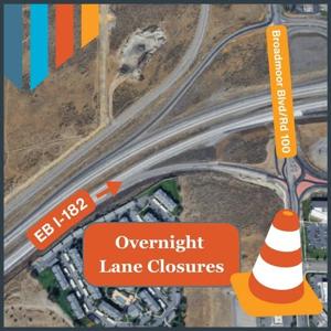 PASCO, Wash – Drivers on I-182 should prepare for delays tonight, February 26, as construction crews close several eastbound lanes near the Broadmoor Blvd/Rd 100 overpass.