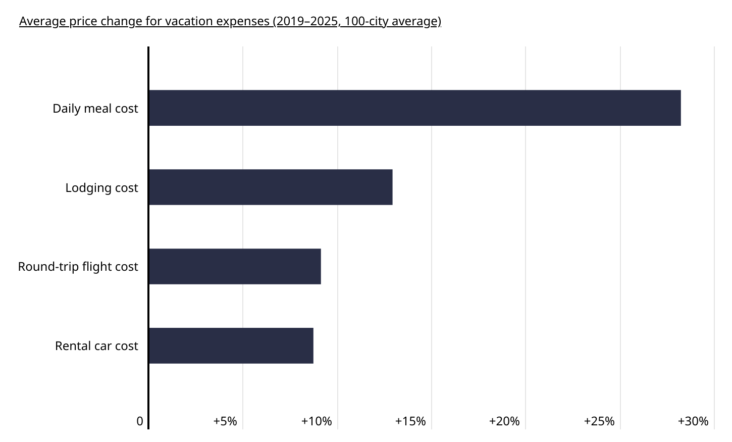 - Dining costs have surged since the pandemic. Among the four major categories of vacation spending, daily meal expenses saw the steepest increase, rising 28.2% between 2019 and 2025—more than double the growth rate for lodging, airfare, or rental cars.