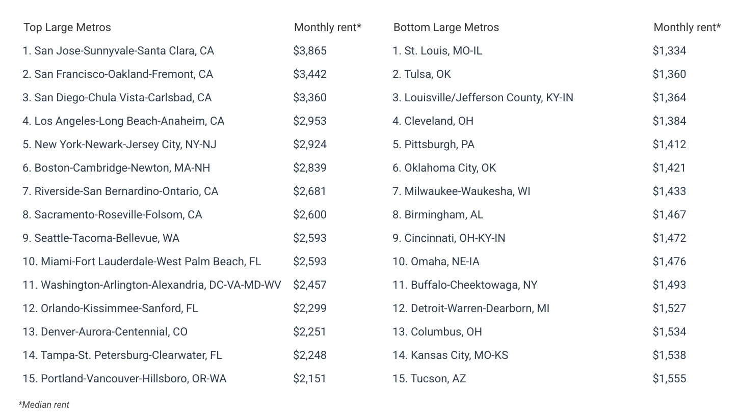 Unsurprisingly, the states with the highest rents are also home to some of the nation’s priciest metropolitan areas for renters. California dominates the list, claiming 9 of the 10 most expensive metros overall, including four of the five most expensive large metros with populations of one million or more.