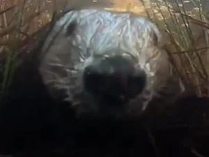 The camera shows beavers passing by – with one swimming directly towards it and then knocking it over into the waterbed.