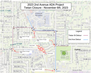 WALLA WALLA, Wash.-The Tietan Street and 2nd Ave intersection will be closed November 6 through 20 for upgrades to make it American with Disabilities Act compliant and for electrical work.