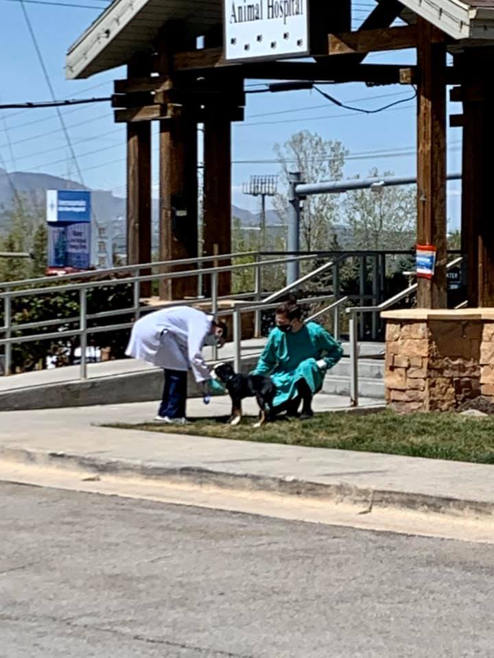 Regular vet: filled in online forms for a new patient (we have a visitor dog in my house), but then there was a form I had to fill our physically—and the receptionist took this out to me. Then the vet tech came and picked the dog up. I dropped her off and came back later, another vet tech came out. Same attire as above.