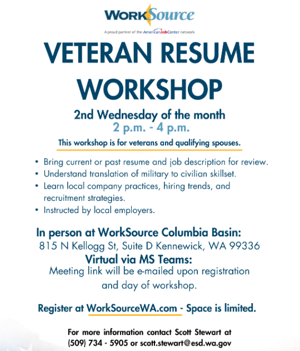 KENNEWICK, Wash.-A resume workshop for veterans and military spouses is set for Wednesday, June 12 at WorkSource Columbia Basin in Kennewick.