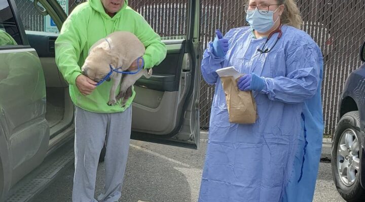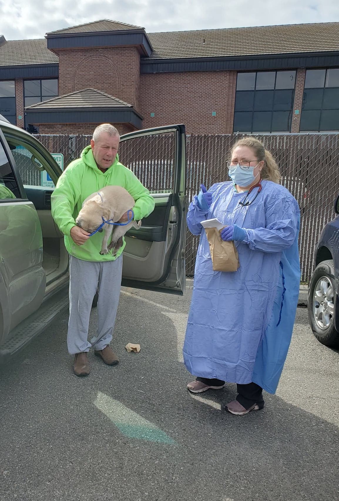Curbside since early March. We were early adopters. We wear PPE to collect patients from vehicles—gloves/masks. We use our leashes, which are sanitized, and we wipe down crates with products rated for coronavirus. We reuse PPE, sanitizing between patients for gloves and each day for masks. We use a mobile credit card machine and clean it between each client. We also sanitize the door and areas used for exams between pets. We are making exceptions for euthanasias.