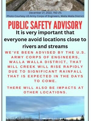 WALLA WALLA, Wash. – Walla Walla County Emergency Management announced a public safety advisory on Wednesday regarding rising water in Mill Creek over the next few days due to incoming storms.