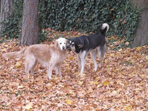 The two dogs were playing in my yard. I threw a tennis ball for my golden retriever but, as often happens this time of year, it got lost in the leaves near the back fence. Both dogs went tearing after the ball but when they got to where they thought it should be, couldn’t easily find it. Caught up in the chase, there they were, suddenly close to each other without prior planning.