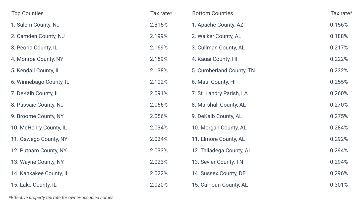 Drilling down to the county level, disparities are even more pronounced. Salem County, NJ has the highest effective tax rate in the country at 2.315%, followed by Camden County, NJ, at 2.199%. Other counties in New Jersey, as well as Illinois and New York dominate the top of the list. In fact, each of the 41 counties with the highest effective property taxes tracked in this analysis are located in one of those three states. Conversely, Apache County, AZ, boasts the lowest rate at 0.156%, with other counties in Alabama, Hawaii, and Tennessee rounding out the bottom tier.