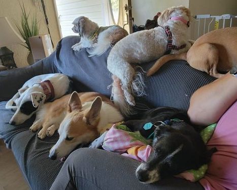 Dawn Elberson Goehring (Hawaii) Four to five in bed with us. Two go undercover towards our feet and the other two or three sleep by the pillow and like to be spooned. We have several dog beds on the floor but they choose the bed. My oldest sleeps on the floor in his bed because he is blind and deaf and we worry about him falling off. When we are home they are usually hanging with us on the couch or on the floor in front of the couch. We have dog beds and two other chairs that two of them like to use, but the others are always with us or on us. When we go out, they choose the couch or chairs. Only the two small older dogs choose the beds, only because they cannot get up on the couch anymore. And as much as I hate to admit it, they all love the stone coffee table! There is always a dog or two on it. Likely because it’s cool. But they get choice, and we are happy with that.