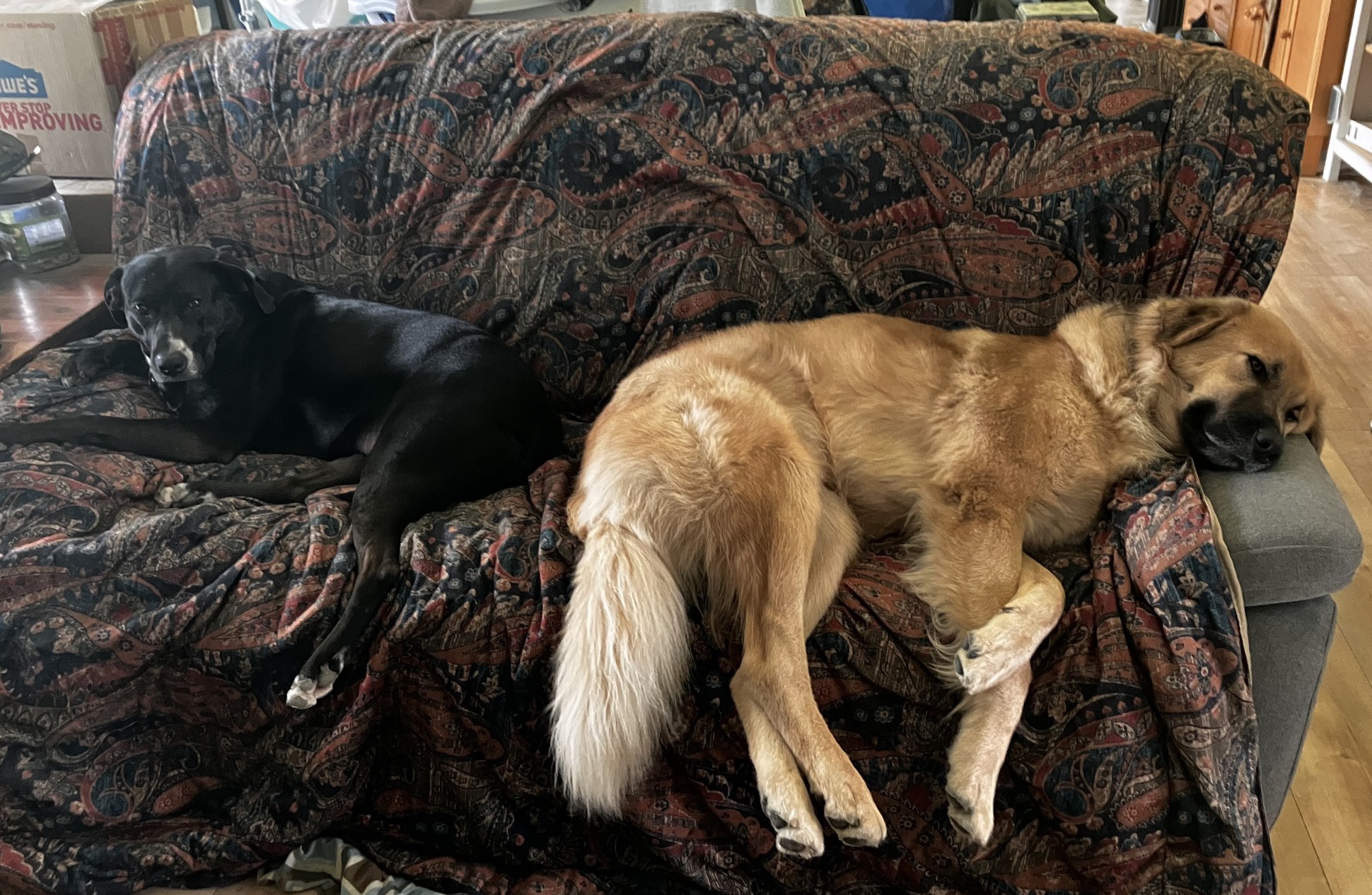 Michaela Kelso (Washington) I’ve got two dogs and four cats. The “little” one, a girl named Blue, sleeps in our bed at night, unless the cats encroach on her space. She weighs about 80 pounds, so takes up a significant amount of bed. We got her as a puppy, and she’s been sleeping there since the beginning. She demands that either my husband or I—but mostly my husband—join her in bed for an afternoon nap. But we also have several dog beds throughout the house, and she uses all of them, along with the couch, the dog couch (yes, one just for her), or anywhere she can be underfoot. The big guy, Dave, occasionally jumps in our bed during the day, but he gets too hot with people around. Also, he respects that it is Blue’s space, unlike those darn cats. At night he often sleeps in front of the front door, or on the sofa, or outside. He is a livestock guardian dog and loves to be outside. We got Dave from the Spokane Humane Society, and he was quite traumatized in the beginning. Now he will sleep on any of the dog beds, the couch (but not the dog couch!), or in any passage that he can block. Blue is the black dog, Dave is the “blonde” on our couch, sometime last year. Yes, that is a three-seater, with room for up to four reasonably sized adults—or two large dogs.