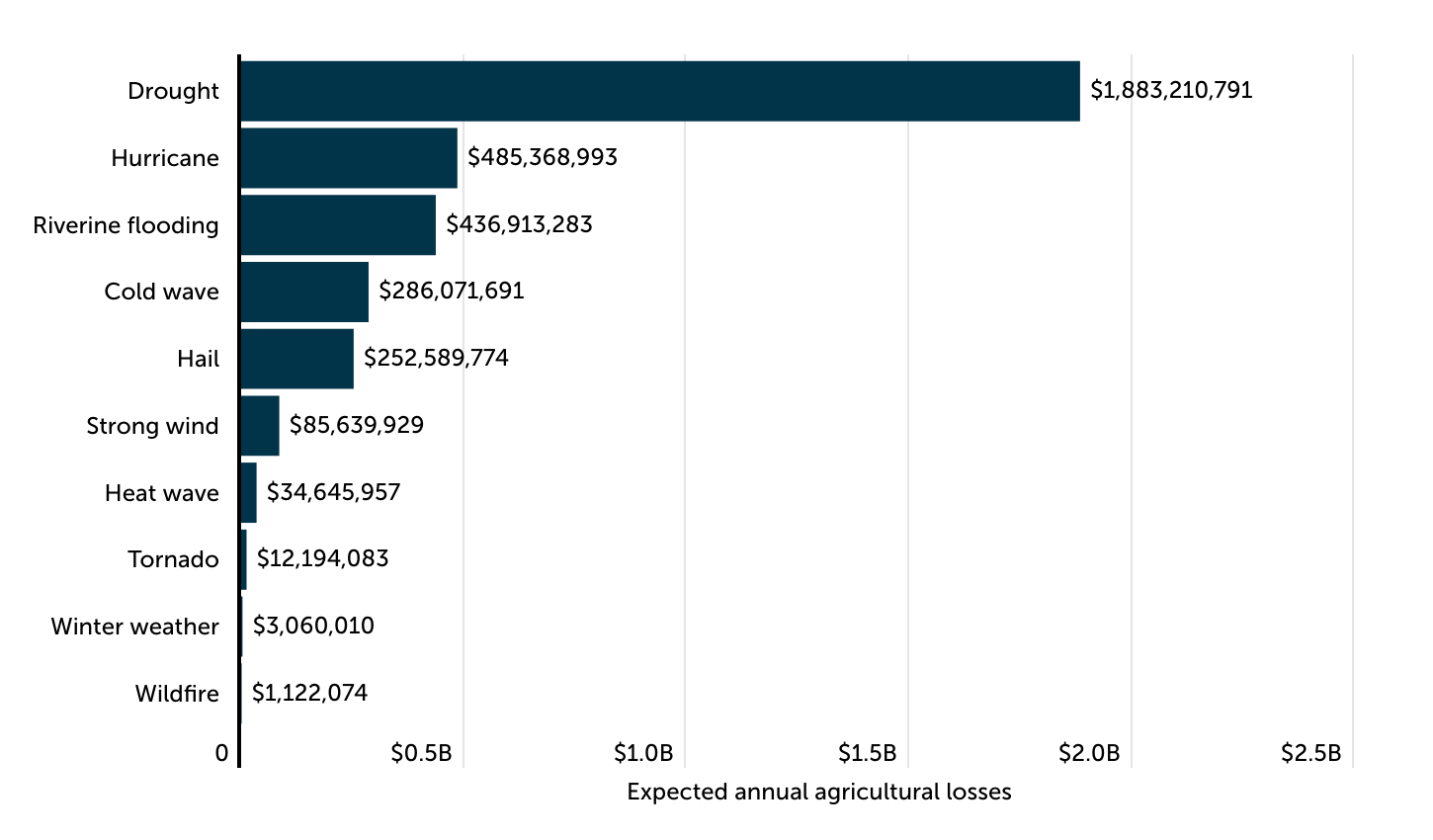 • FEMA estimates that the U.S. loses approximately $3.5 billion in agricultural value each year due to natural hazards—primarily drought—or more than $1,800 per farm.