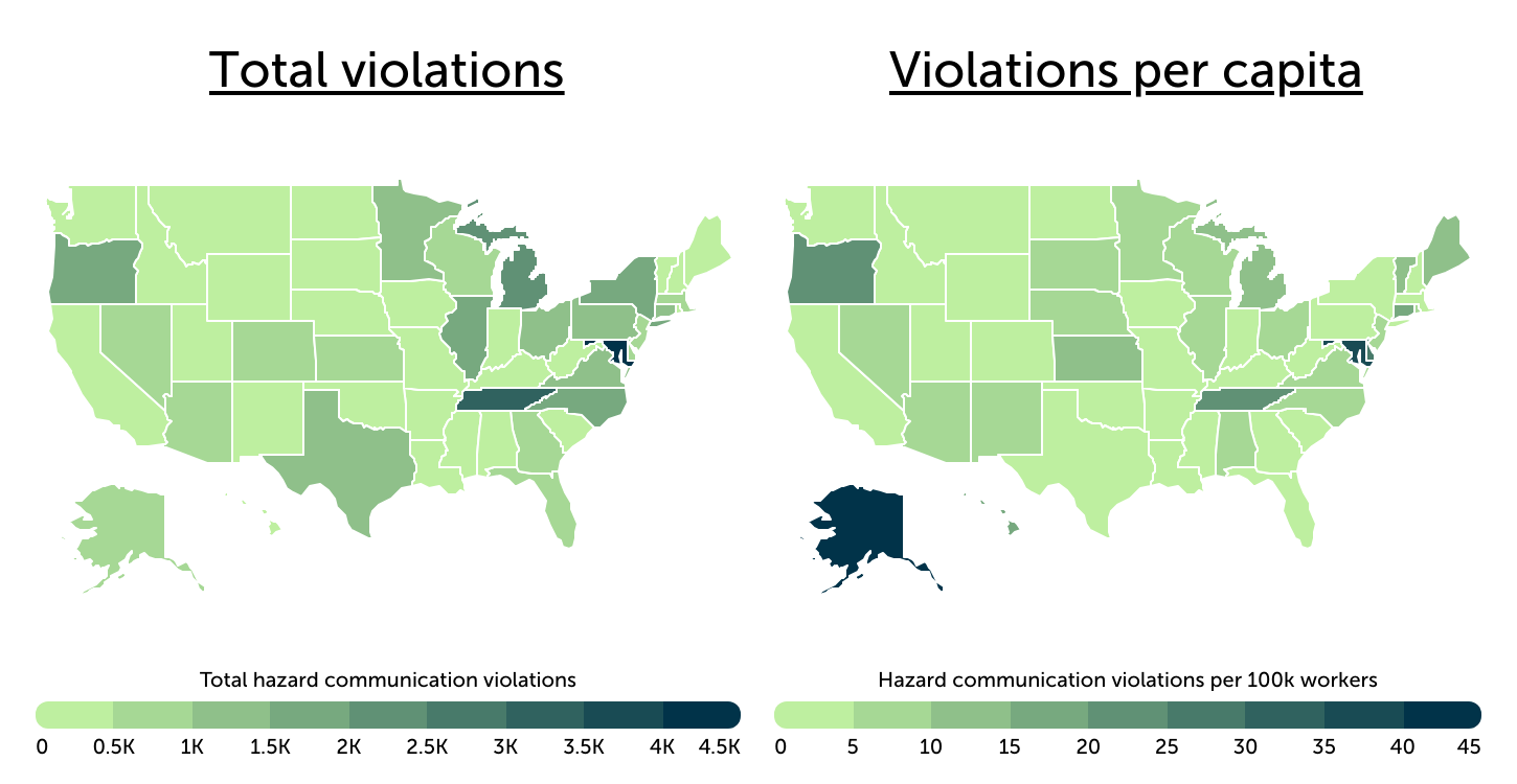 • Maryland leads the nation in total HazCom violations. There were 4,370 violations during the 2021–2025 period, equal to 39.0 violations per 100,000 workers, one of the highest rates in the country.