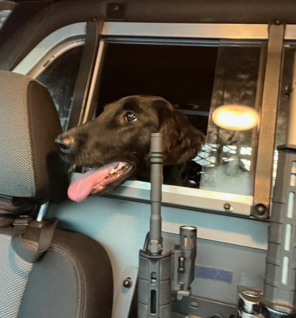 As I was approaching my house, I saw a police car coming slowly in the opposite direction. He stopped in front of my house. As I pulled up beside him, I said hopefully, “PLEASE tell me you have my dog!!!” He rolled down the rear window and KD popped her head out!